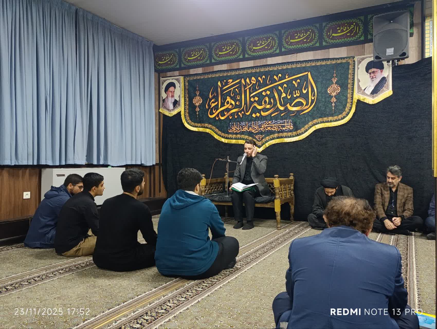 در این مراسم معنوی و معطر به عِطر فاطمی تعداد ۱۷ نفر از دارالایتام مجتمع تربیتی متقین نیز حضور داشتند. این مراسم معنوی که روز یکشنبه دوم آذرماه همزمان با اقامه نماز مغرب و عشاء در نمازخانه این دانشکده برگزار شد، پس از تلاوت آیاتی از کلام الله مجید توسط یکی از دانشجویان آقای سید حیدر موسوی حجت الاسلام و المسلمین سید حجت حسینی درخصوص فضایل و کرامات صدیقه کبری فاطمه زهرا (س) ایراد سخنرانی نمود و در ادامه مداحان اهل بیت (ع)کربلایی امید دستاران و سید حیدر موسوی نیز به ذکر مصیبت و مرثیه خوانی پرداختند.