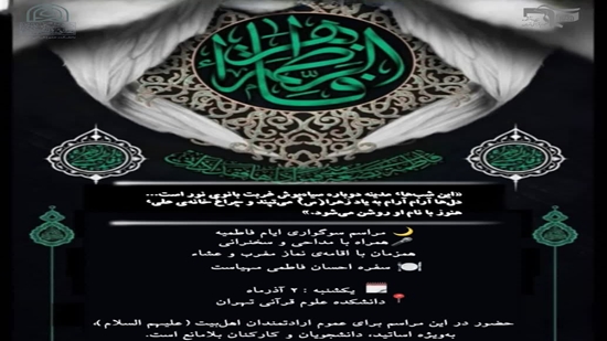 اطلاعیهبرگزاری مراسم سوگواری شهادت حضرت زهرا سلام الله علیها روز یکشنبه ۲ آذرماه همزمان با نماز مغرب و عشاء در دانشکده علوم قرآنی تهران برگزار می گردد.